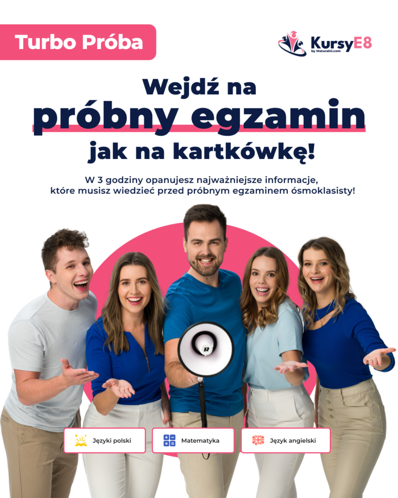 Turbo Próba to nagrana w formie wideo powtórka przygotowująca do egzaminu próbnego. Podczas 3h powtórki powtarzamy najważniejsze treści do egzaminu z danego przedmiotu. Turbo Próbę organizujemy z: języka polskiego, matematyki i języka angielskiego.